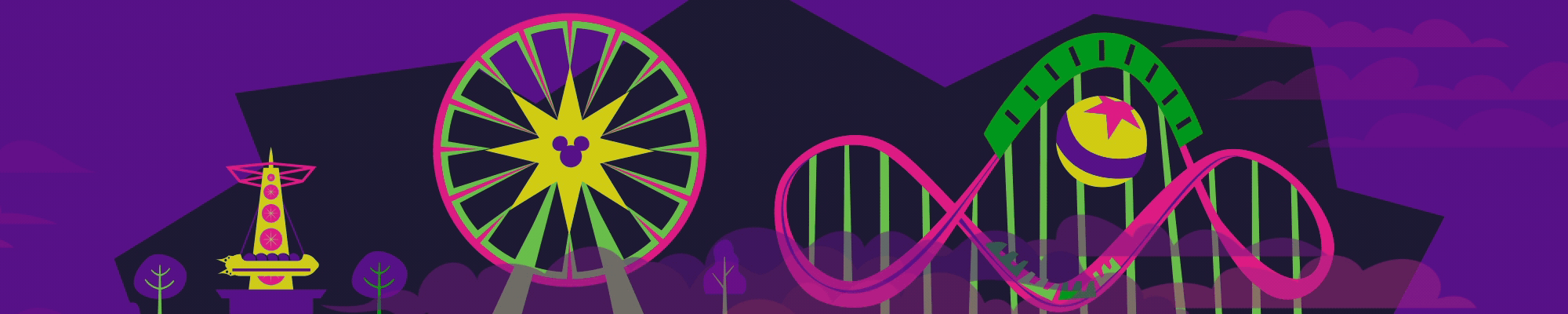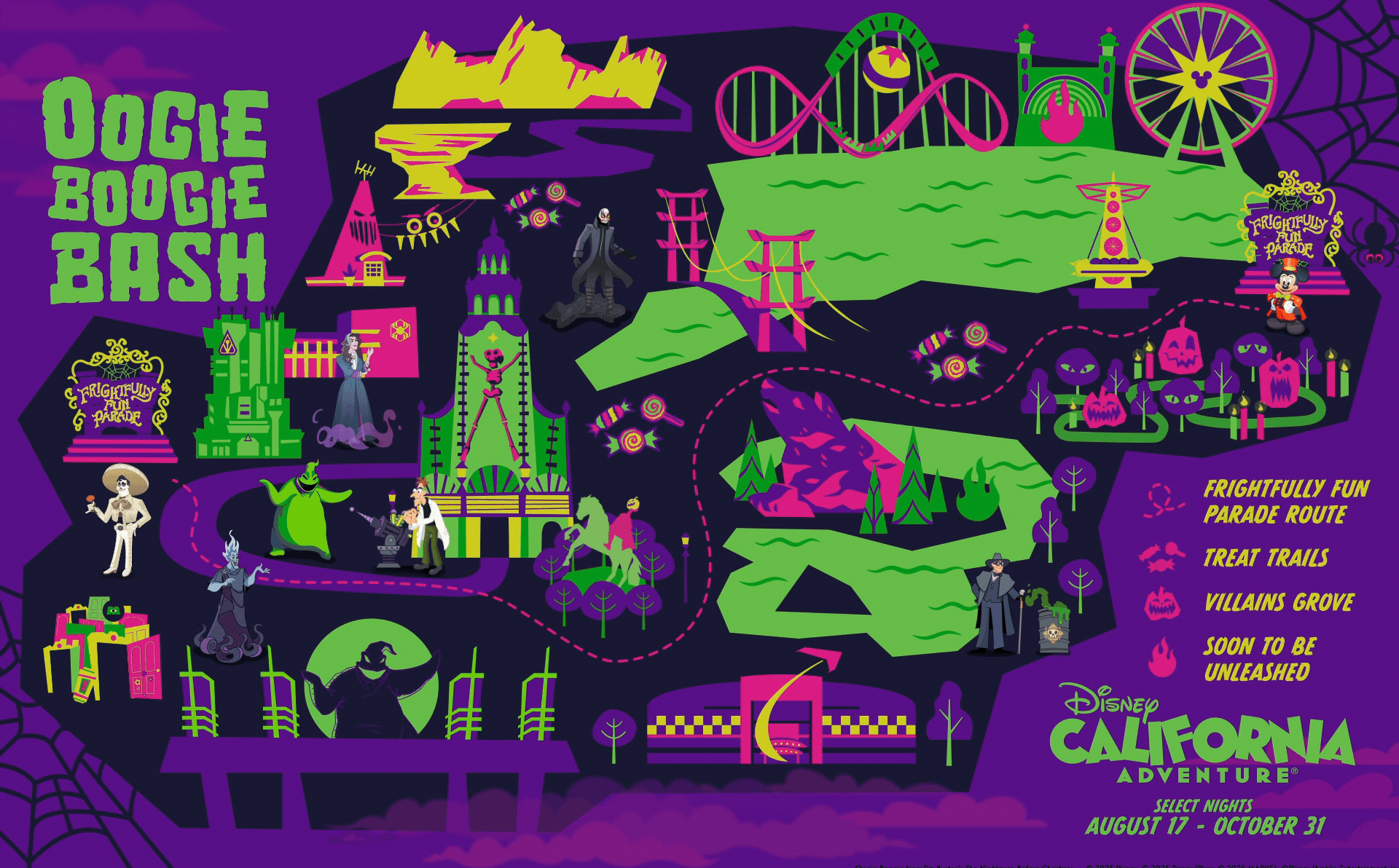 For Disneylandβs Oogie Boogie Bash, I created animated villains and map effects for a Halloween version of the California Adventure treat trail map. The challenge was unifying characters from mixed source styles, including live-action, classic animation, and modern cartoon, while keeping everything consistent within the mapβs visual system.
